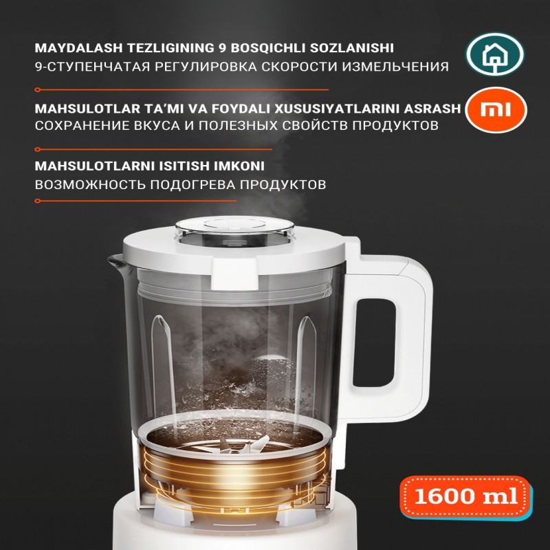 Xiaomi Smart Blender blenderining 9 ta ish rejimiga mavjud bo‘lib, ular ham yumshoq, ham qattiq mahsulotlarni turli tezliklarda aralashtirish imkonini beradi.